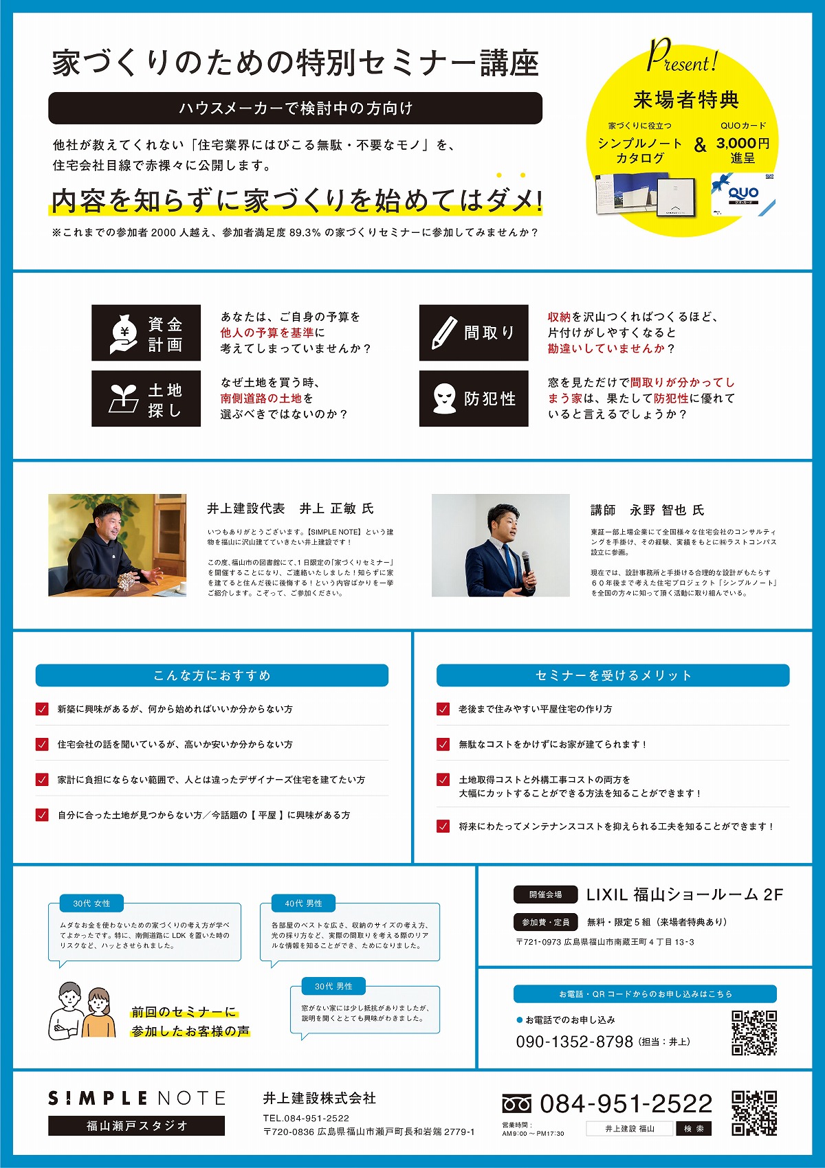 この度、LIXIL 福山ショールーム2Fにて、1日限定の「家づくりセミナー」を開催することになり、ご連絡いたしました!知らずに家を建てると住んだ後に後悔する!という内容ばかりを一挙ご紹介します。こぞって、ご参加ください。