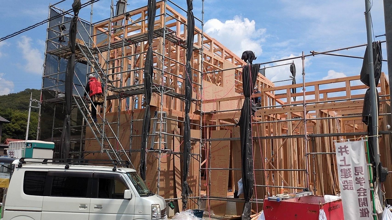 朝から晴れ渡る空のもと、職人たちの掛け声とともに、家の骨組みが次々と組み上がっていきます。