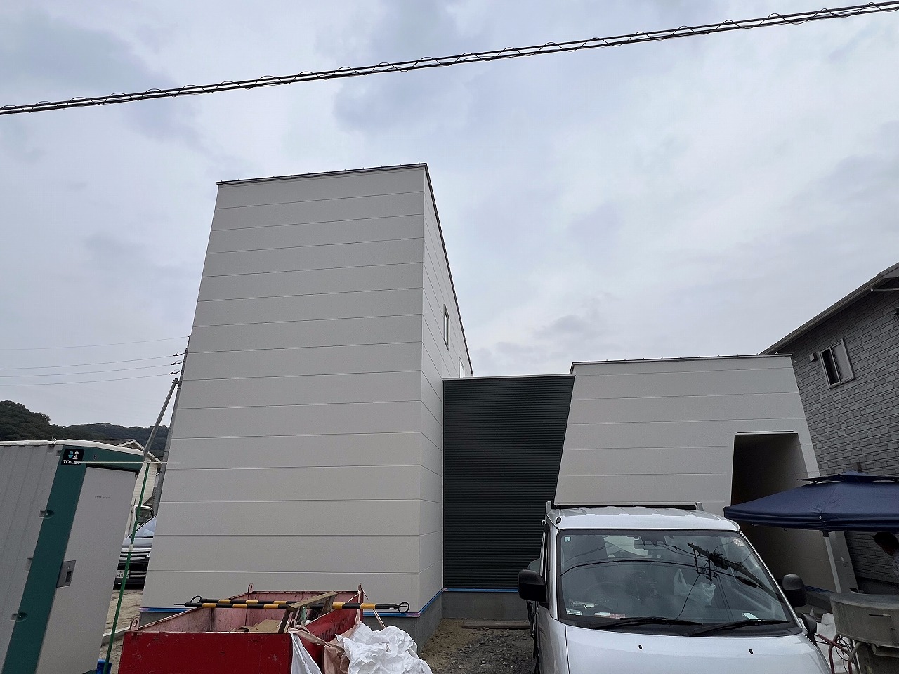 これまで骨組みだった構造体が、白い外壁をまとい、住まいとしての存在感を放ち始めています。